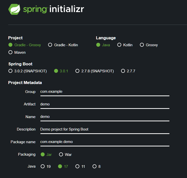 작성일 기준으로 Spring Initializr를 사용하여 스프링 부트 프로젝트를 생성할 때 3.0.0 이상인 버전과 2.7.X 버전 중에서 선택할 수 있다. 아직은 2.6.X나 2.7.X 버전을 사용하는 경우가 많으나, 언젠가는 3.0.0 이상인 버전을 사용하게 되는 경우가 더 많아질 수가 있다.