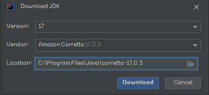 여기서 17버전 이상의 JDK가 있다면 해당 JDK를 선택하면 되고 없는 경우에는 SDK의 콤보박스를 열어 Download JDK...에서 새로운 JDK를 설치한다. Download JDK...를 클릭하면 다음과 같은 창이 나타나는데 여기서 17 이상의 버전을 선택하고, JDK 종류를 선택한 후 원하는 경로에 다운로드하면 인텔리제이의 백그라운드에서 JDK 설치를 진행한다. 본 예제에서는 Amazon Corretto 17.0.5를 다운로드 받는다.