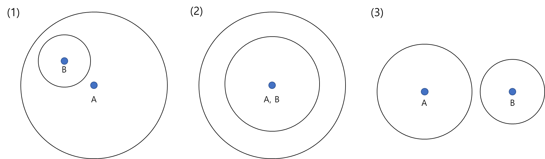 위 그림의 (1) 처럼 한 원의 내부에 다른 원이 존재 하면서 두 점 사이의 거리가 반지름의 차이와 일치하는 경우, 즉 작은 원의 반지름과 두 점 사이의 거리를 합한 값이 큰 원의 반지름 길이와 일치하는 경우와 두 점 사이의 거리가 두 원의 반지름 합계와 일치하는 경우에는 류재명이 있을 수 있는 위치가 한 점 뿐이므로 1을 출력해야 한다.