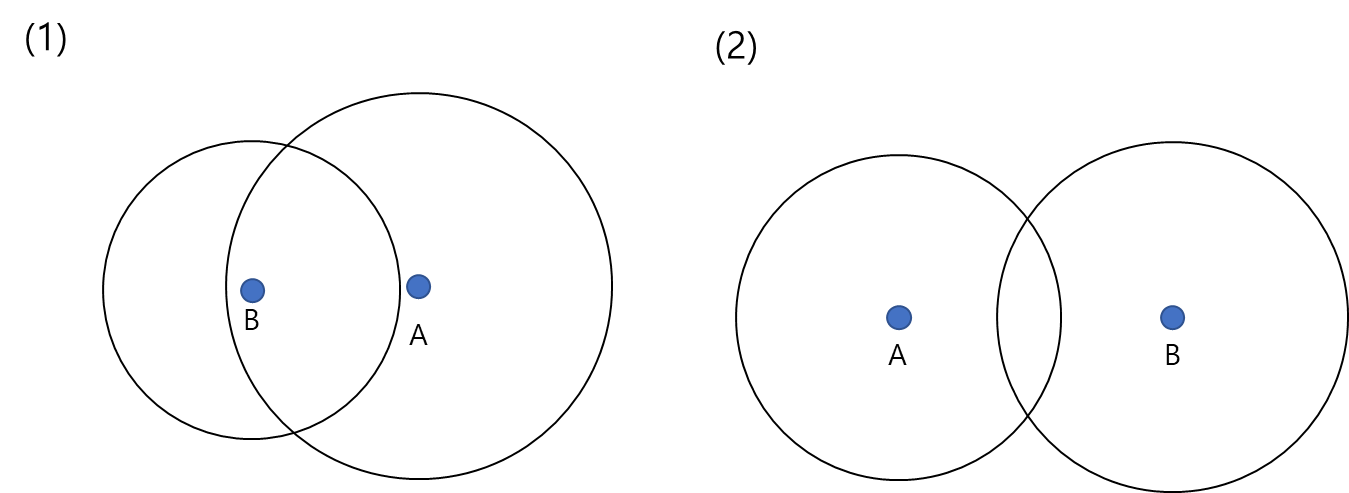 나머지의 경우는 위 그림의 (1) 처럼 두 원의 반지름 길이의 차이가 두 점 사이의 거리보다 작은 경우, 즉 작은 원의 반지름 길이와 두 점 사이의 거리를 합한 값이 큰 원의 반지름 길이보다 크거나 두 점 사이의 거리가 두 원의 반지름 합계보다 작은 경우가 남는다. 이 경우에는 그냥 else로 처리해줄 수 있다.