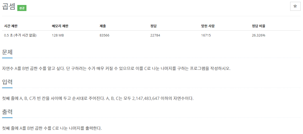 문제에서는 \(A^B\)를 \(C\)로 나눈 나머지를 구하라고 했으므로, 위에서 진행한 거듭제곱을 구하는 과정에서 \((a\times b) \mod c=(a\mod c)\times (b\mod c)\)인 점을 이용하여 \(C\)로 나누는 연산만 적절하게 추가해주면 된다.
