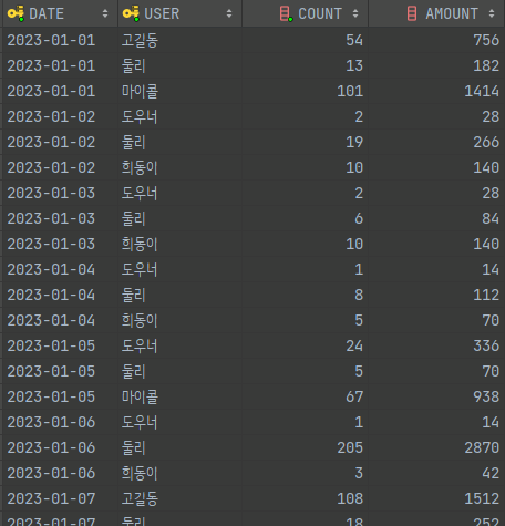 for문을 돌리면서 해당 날짜에 해당하는 데이터만 추출한다. - 사용자의 이름을 key로 하고, count와 amount를 필드로 갖는 객체를 value로 하는 Map을 생성한다.