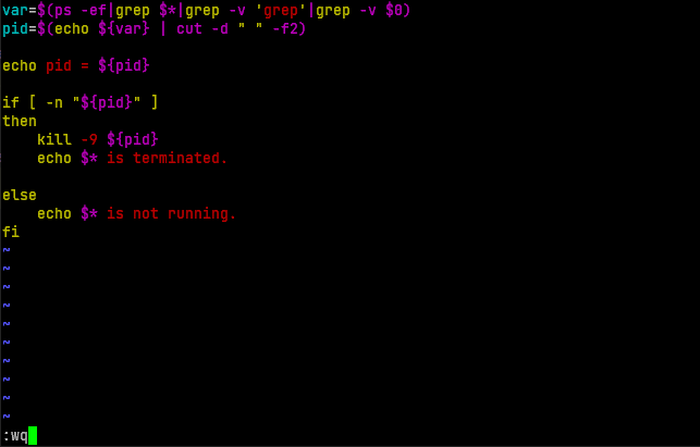모든 내용을 작성하였다면 esc를 누르고 :wq를 입력하여 저장하고 vim 에디터를 종료한다. 아래 내용에서는 제대로 pid를 가져왔는지 확인하기 위해 echo로 pid를 출력하는 부분을 추가했다.
