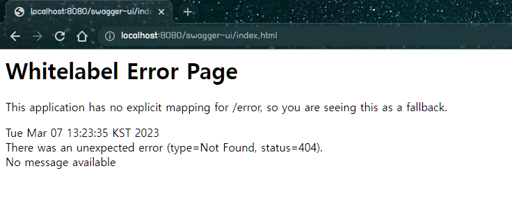 JPA 공부를 위해 스프링부트 프로젝트를 생성할 때 새로운 버전을 사용해보자는 마음으로 스프링부트 3.0.3 버전으로 프로젝트를 생성했다. 그리고 평소처럼 Springdoc의 스웨거 UI를 사용해서 API를 호출하려고 했는데 스웨거 문서에 접속하니까 404 에러가 반겨줬다.
