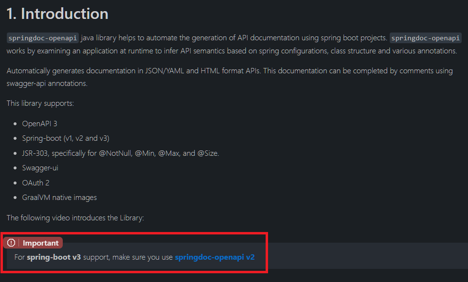 결론부터 이야기 하자면 스프링부트 3버전에서 Springdoc을 사용하기 위해서 Gradle / Maven에 추가해야하는 의존성이 이전과는 다르다는 점이다. Springdoc 공식 가이드 문서를 확인해보니 아예 Important라면서 v2를 사용하라는 안내가 있었다.