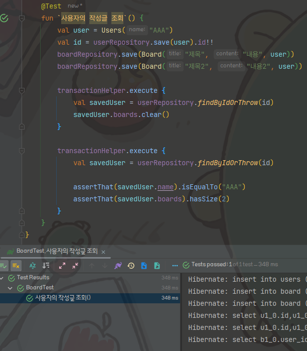 연관 관계의 주인을 지정하게 되면 두 엔티티 사이의 외래키는 연관 관계의 주인만 관리할 수 있고, 주인이 아닌 쪽은 연관된 객체를 읽는 것만 가능하다. 주인이 아닌 쪽에서 연관 관계 설정을 위해 갖는 객체는 단순히 이 객체가 이러한 자식들을 갖고 있다는 것을 보여줄 뿐이고, 실제 DB 상의 데이터와 매핑되진 않는다. 예시의 Board - User 구조에서 User 객체의 boards에 있는 Board 객체를 수정하거나 삭제해도 DB에 있는 Board 테이블에는 아무일도 일어나지 않는다. 예를 들어 아래와 같은 테스트 코드를 실행해도 실제 Board는 삭제되지 않기 때문에 테스트가 정상적으로 통과하는 것을 볼 수 있다.