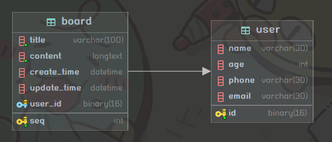 이 구조에서 DB 상으로 게시글은 작성자가 누구인지에 대해 user의 id를 외래키로 갖게 된다. 이 user_id를 통해 게시글의 작성자에 대한 정보를 조회할 수 있고, 반대로 사용자가 작성한 게시글에 대한 정보를 조회할 수도 있다.
