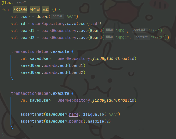 - 2에서 조회한 User 객체의 boards에 새로운 글에 해당하는 Board 객체 추가. 이 과정에서 새로운 글에 해당하는 Board 객체의 작성자에 해당하는 user가 갱신되면서 외래키 갱신