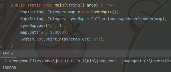 여기서 synchronizedMap()의 파라미터는 HashMap이 아닌 다른 Map 구현체가 와도 상관없다.