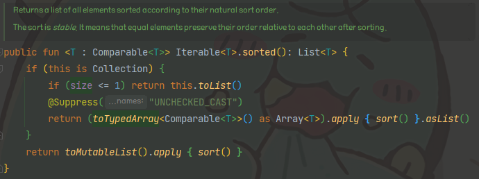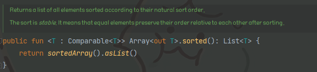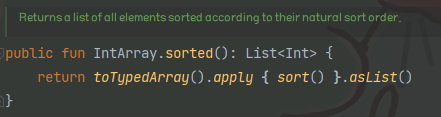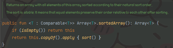 sortedArray()의 내부 구조는 다음과 같으며, 원시배열(IntArray, DoubleArray 등, 자바의 원시타입 배열)이나 Array<T> 모두 같은 내용이 작성되어 있다.