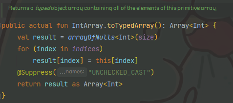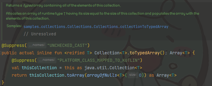 문제는 두번째와 세번째의 경우인데 두 경우 모두 toTypedArray()라는 메소드를 통해 배열로 변환하여 정렬하는 것을 볼 수 있다. 이 toTypedArray()가 문제가 되는데 그 내부 구조를 보면 다음과 같이 되어있다.