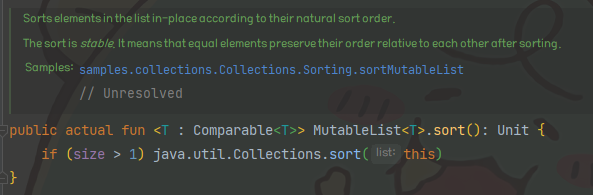 sort()는 원본 배열이나 리스트를 정렬한다. 원본 그 자체의 요소들을 정렬하기 때문에 배열은 상관없지만 리스트라면 mutableList에만 사용할 수 있다. 불변 리스트는 리스트의 요소들을 수정할 수 없기 때문이다.