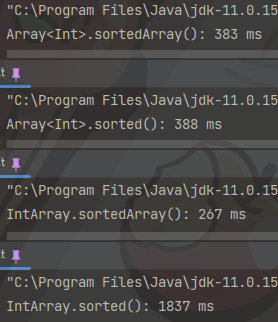 실제로는 배열을 초기화하는데 걸리는 시간까지 포함하면 Array<Int>의 두 정렬 메소드 모두 IntArray.sorted()와 비슷한 시간이 걸린다.
