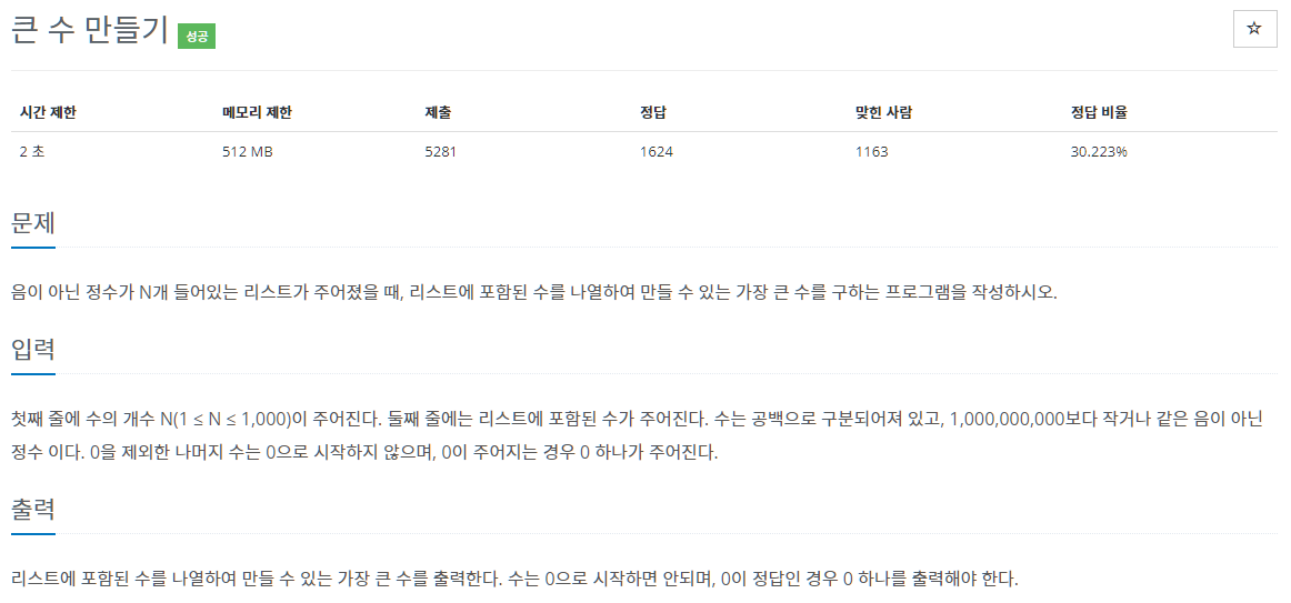 출력 조건에 수는 0으로 시작하면 안되며, 0이 정답인 경우에는 0 하나만 출력해야 한다고 되어 있는데, 상술한 조건대로 정렬한 숫자들을 나열한 결과가 0이 아닌 수라면 0으로 시작할 수 없다. 따라서, 배열의 0번째 요소가 0이라면 0을 출력하면 된다. 또는, 배열에서 0의 개수가 배열의 크기와 같은 경우도 정답이 0인 경우에 해당한다. 두 경우 모두 시간차이가 발생하진 않았다.