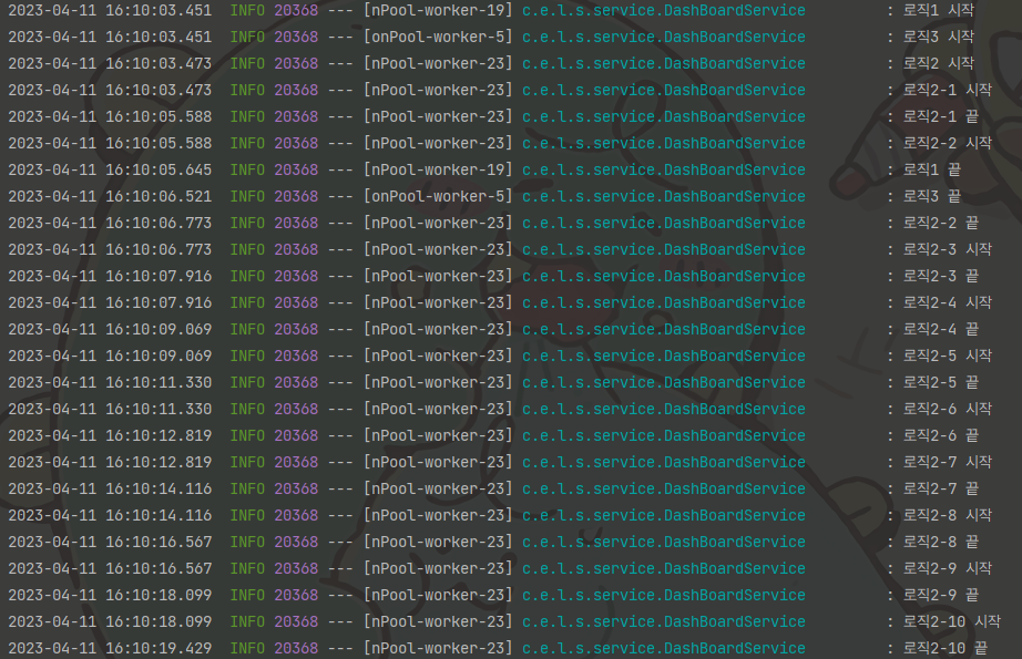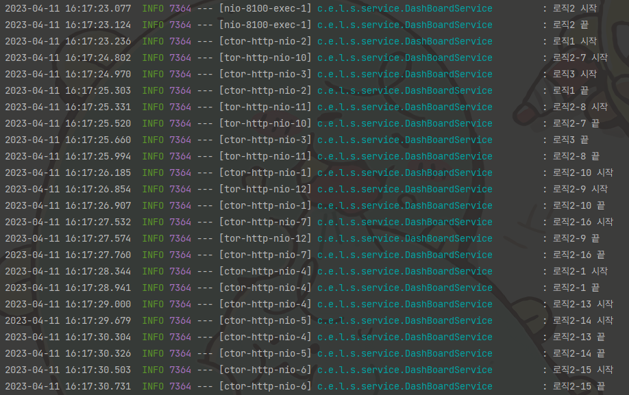 실제로 로그를 찍어보면 로직들끼리는 별개의 스레드에서 비동기로 동작하지만 각 로직 내부는 동일한 스레드에서 순차적으로 서브로직이 시작되고 종료되는 상태였다.