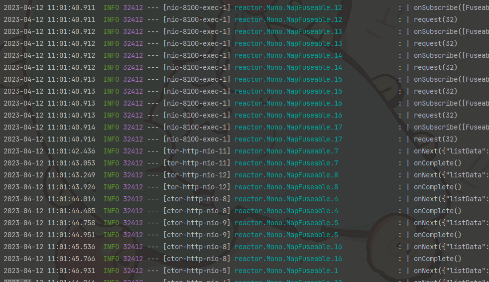 WebClient 자체가 비동기 방식으로 동작하니 CompletableFuture를 사용하지 않아도 각 로직이 비동기적으로 호출되는 것을 확인할 수 있다. 또한, 동일한 스레드에서 순차적으로 서브로직이 실행되던 이전 코드와 달리 각기 다른 스레드에서 순서 상관없이 마구잡이로(?) 서브로직이 실행되는 것도 확인할 수 있었다.