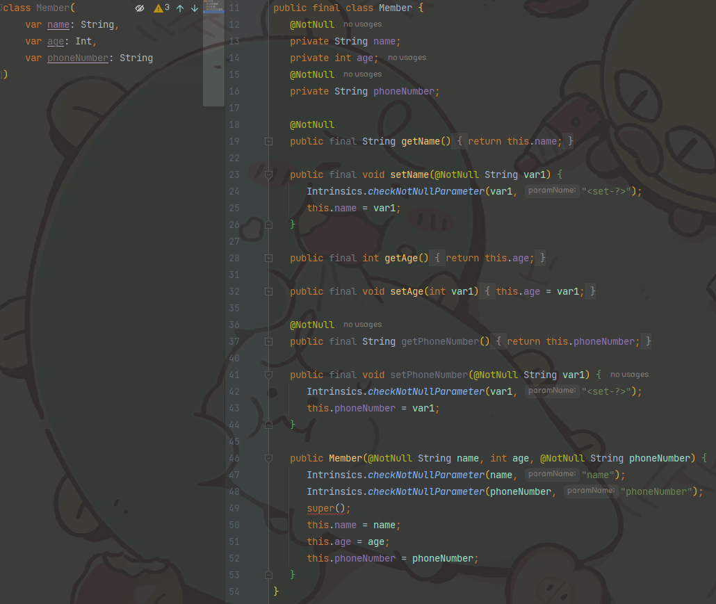 반면에 코틀린에서 클래스의 멤버 변수를 선언하게 되면 자바 바이트코드 상으로는 자동으로 Getter와 Setter가 함께 생성된다. 이렇게 자동으로 생성된 Getter와 Setter는 자바처럼 val name = member.getName()이나 member.setName("춘식이")의 형태로도 사용할 수는 있지만 기본적으로는 val name = member.name이나 member.name = "춘식이"와 같이 멤버 변수를 직접 다루는 형태로 사용하게 된다.(실제로 직접 다루는 것은 아니지만)
