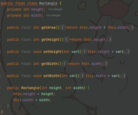 이 클래스를 자바 코드로 디컴파일 해보면 area라는 멤버 변수가 존재하는 것이 아니라, getArea()라는 메소드만 존재하는 것을 확인할 수 있다.