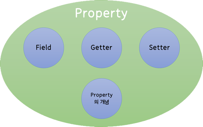 여기서 필드와 프로퍼티의 차이를 알 수 있는데, private 변수인 name, age, phoneNumber 각각의 프로퍼티를 담는 필드가 된다. 그리고 이들의 Getter는 해당 프로퍼티의 필드 값을 조회하는 메소드가 되고, Setter는 해당 프로퍼티의 필드 값을 변경하는 메소드가 된다고 볼 수 있을 것이다. 정확한 것은 아니지만 아래의 그림과 같이 필드가 프로퍼티에 포함되는 구조라고 볼 수 있지 않을까 싶다.
