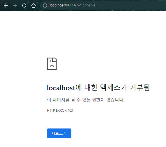 위 설정과 같이 모두에게 허용할 URL 목록에 /h2-console/**을 추가했음에도 불구하고 H2 콘솔에 접속하면 403 에러가 반겨줬다.