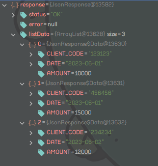 일단 위의 JSON을 객체로 받기 위한 클래스를 아래와 같이 만들었다.
