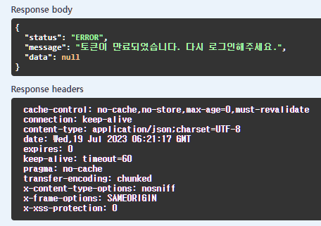 - 리프레시 토큰이 유효하지 않은 경우에는 예외를 발생시켜 오류 응답을 반환한다.