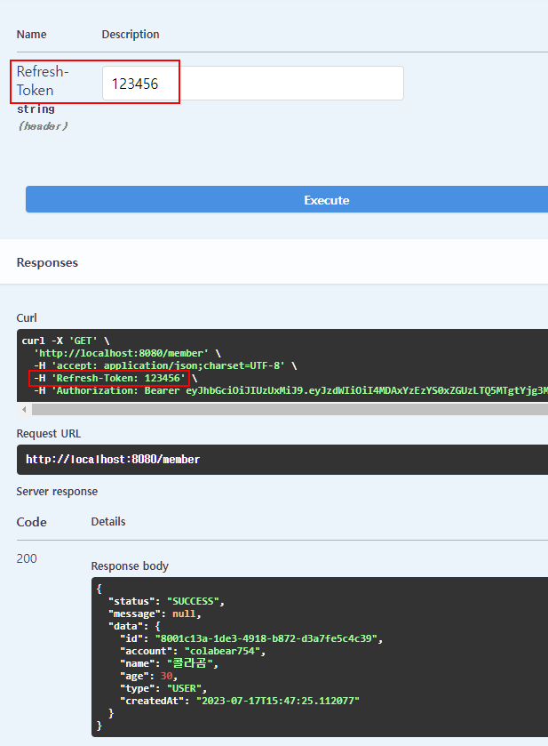 새로 추가된 Refresh-Token 파라미터에 값을 추가해서 API를 호출해보면 다음과 같이 헤더에 Refresh-Token이라는 값으로 담겨서 전달되는 것을 볼 수 있다.