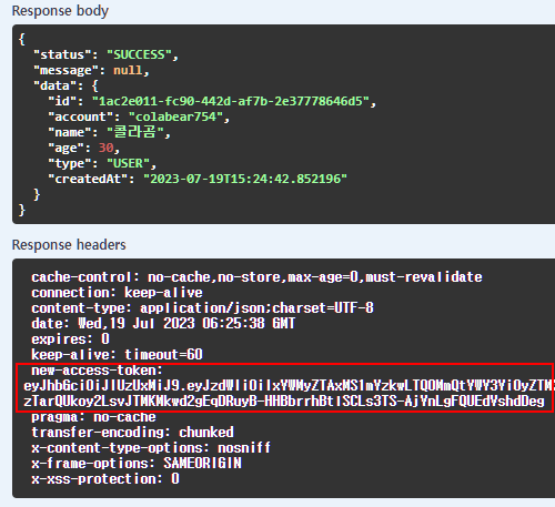 - 리프레시 토큰이 유효하면 새로운 액세스 토큰을 응답 헤더에 담아서 정상 응답을 반환한다.