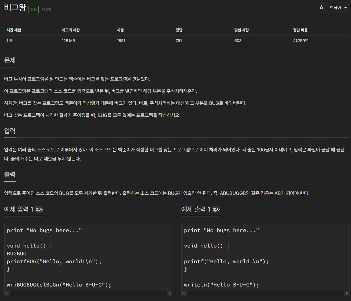 BUG라는 문자열을 모두 제거하기 위해 단순히 replace()로 처리하면 되긴 하지만 출력 설명의 예시를 잘 주목해야 한다.