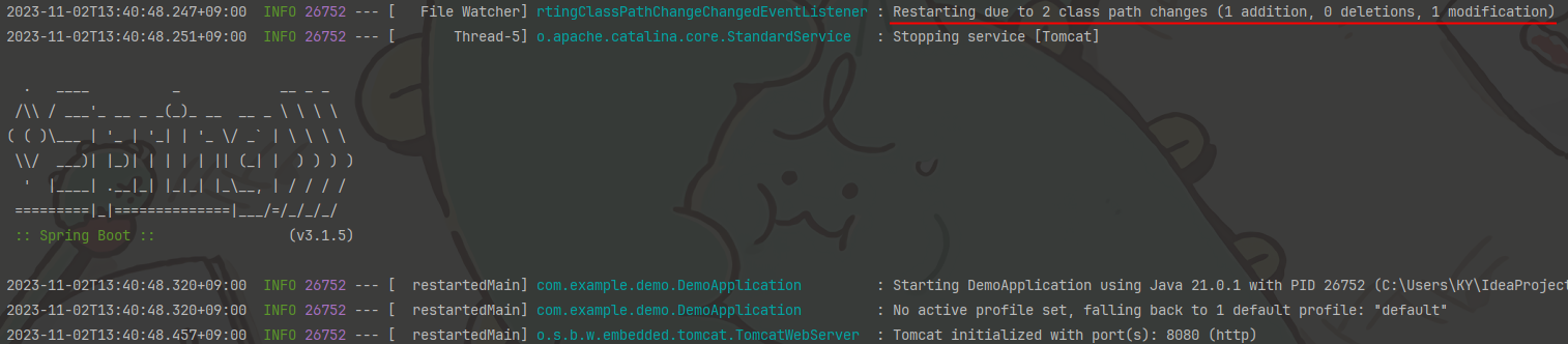 여기까지 설정해놨다면 프로젝트가 실행중인 상태에서 클래스나 리소스를 추가 / 삭제 / 수정하고 다른 창(웹 브라우저 등)으로 포커싱을 옮겼을 때 자동으로 프로젝트가 재실행되는 것을 볼 수 있다.
