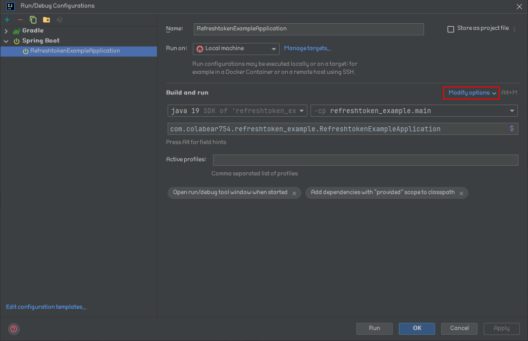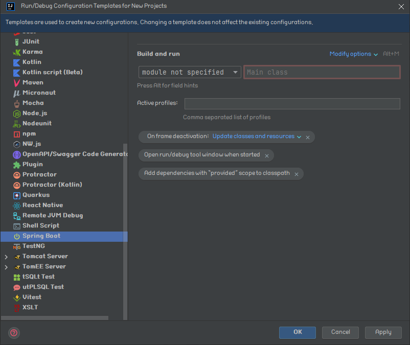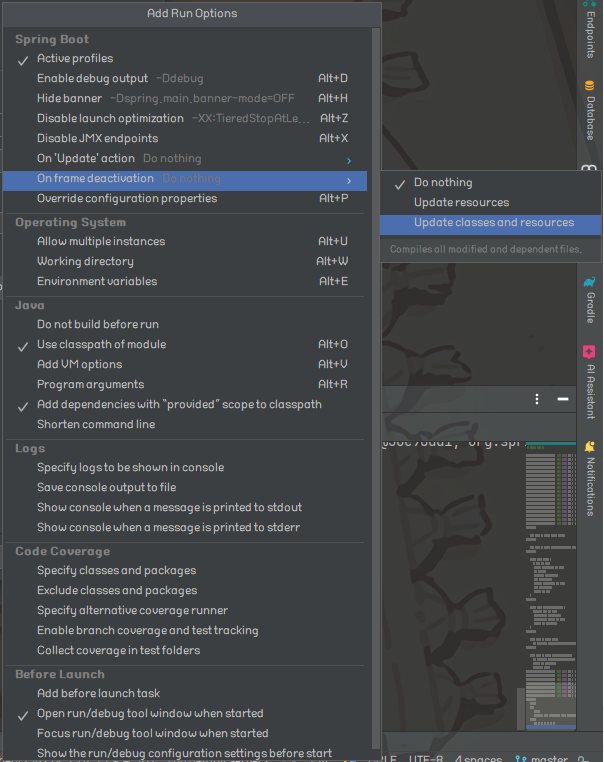 좌측 리스트를 아래로 내려서 Spring Boot를 찾은 후 위 과정과 동일하게 Modify options → On frame deactivation → Update classes and resources를 선택하여 실행 옵션에 추가해준다.
