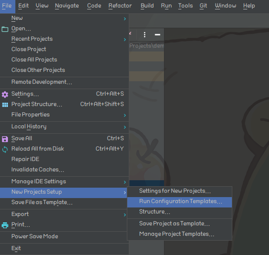 상단 메뉴의 File → New Projects Setup → Run Configuration Templates...로 들어간다.