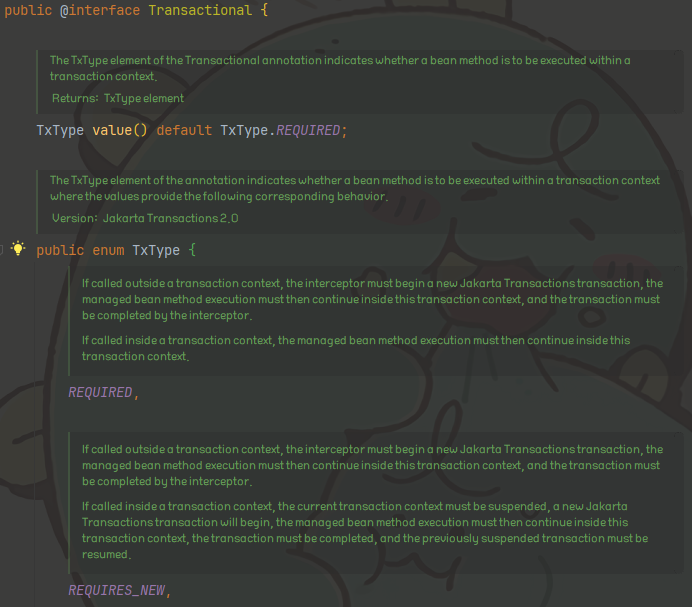 여기서 @Transactional의 속성 중 TxType이라는 타입이 있다. 어노테이션이 붙은 메소드나 클래스가 어떤식으로 동작할 것인지를 결정하는 Enum 클래스인데 기본값은 REQUIRED로 되어있다.