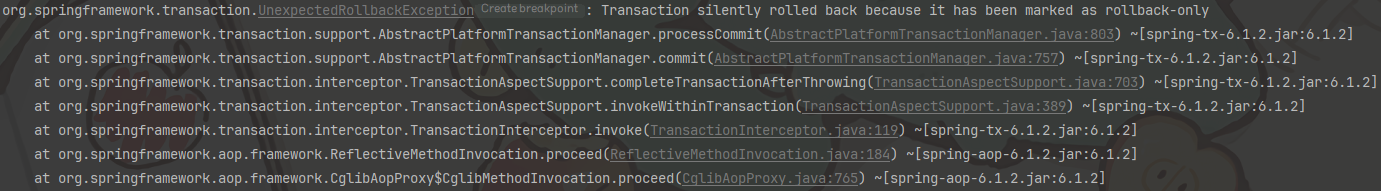 위의 상황에서 TransactionController의 메소드들은 클래스단에 선언된 @Transactional로 인해 트랜잭션 메소드가 된다. 그리고 이 트랜잭션 메소드에서 TransactionService에 있는 또다른 트랜잭션 메소드를 호출하고 그 메소드에서 예외가 터져버리는 상황으로 볼 수 있다.