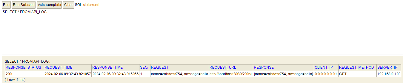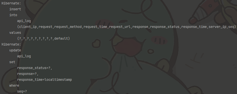 - 요청이 들어올 때 요청에 대한 데이터만 먼저 DB에 기록하고(INSERT) 응답이 나갈 때 응답에 대한 로그를 갱신한다(UPDATE).