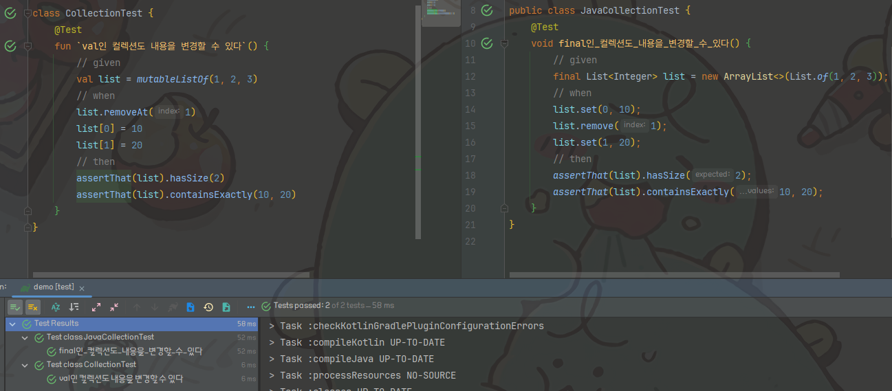두 경우 모두 val과 final로 리스트를 선언했지만 요소를 제거하거나 변경하는건 아무 문제 없이 할 수 있다.