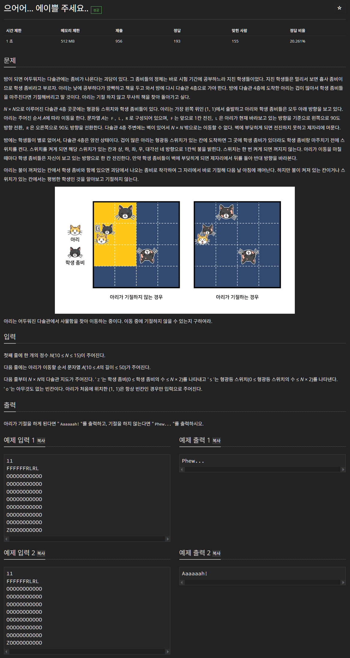 1.에서 아리가 이동하고 2.에서 스위치를 작동시켰기 때문에 좀비들을 이동시키기 전에 아리가 불이 꺼진 상태에서 좀비와 마주쳤는지 확인해야 한다. 여기서 아리의 현재 칸에 불이 꺼져있는데 좀비와 마주쳤다면 바로 Aaaaaah!를 출력하고 프로그램을 종료한다.