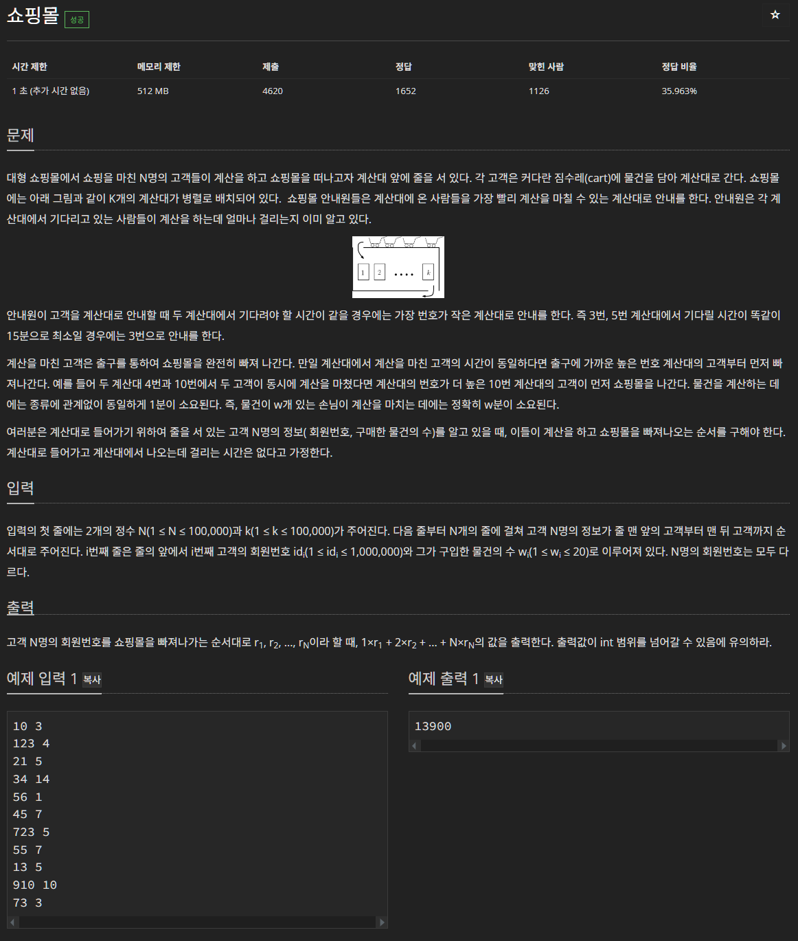 마지막으로 매장에서 나온 고객을 시간순 → 계산대 번호가 큰 순서로 정렬한 후 모든 고객들에 대해 매장에서 나온 순서\(\times\)회원번호의 합계를 계산하여 출력한다.