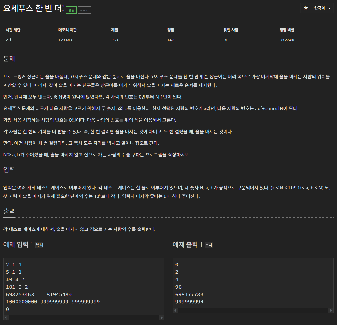 현재 사람의 번호가 \(x\)일 때 다음 사람의 번호는 \(ax^2+b\mod N\)이 된다. 처음에는 \(x=0\)이기 때문에 다음 순서의 사람 번호는 \(b\)가 된다.