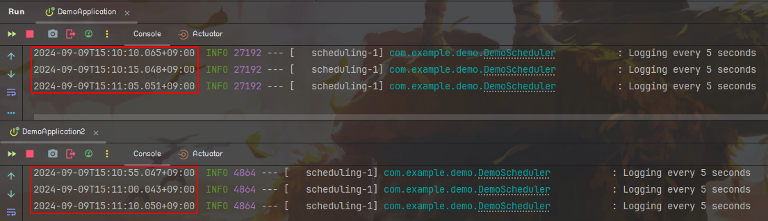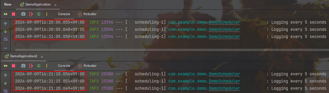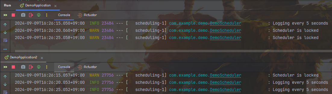 위와 같이 변경해놓고 애플리케이션을 실행해보면 한쪽은 잠금을 획득해서 Logging every 5 seconds가 출력되고 다른쪽은 스케쥴러가 잠겨있어서 Scheduler is locked가 출력되는 것을 볼 수 있습니다.