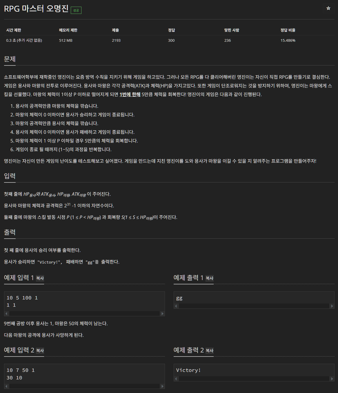 하지만 문제에서 요구하는 답을 구하려면 용사가 쓰러지기 전에 마왕이 먼저 쓰러지는지의 여부만 확인하면 되기 때문에 단순 수학 계산만으로도 판별할 수 있습니다.
