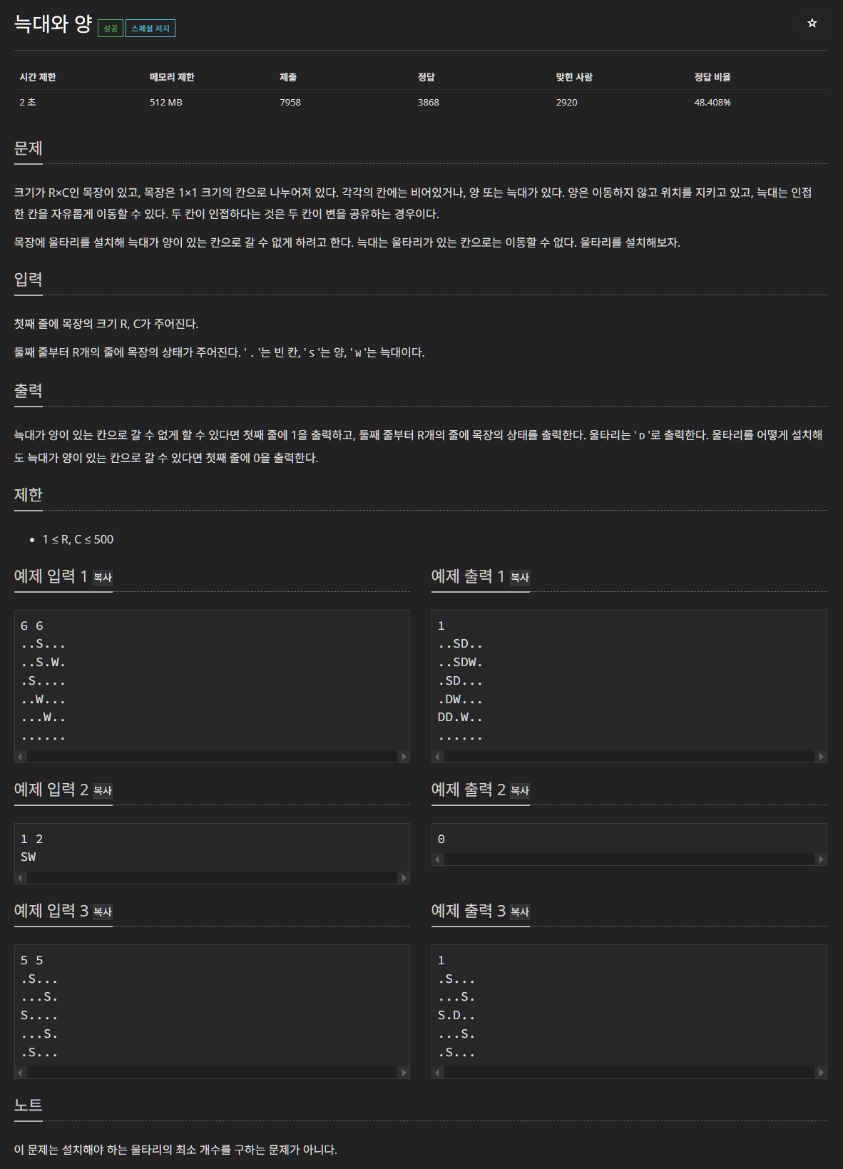 여기서는 목장의 모든 좌표를 순회하면서 늑대가 있는 좌표의 상하좌우에 양이 있으면 실패 처리하고, 빈공간이면 울타리를 놓아 늑대를 가두는 방법 해결했습니다.