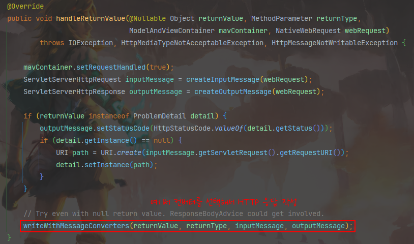 RequestResponseBodyMethodProcessor에서 응답을 처리하는 과정을 조금 더 자세히 보면 내부의 handleReturnValue()에서 컨트롤러 메소드의 반환값을 처리할 수 있는 컨버터를 선택하고 HTTP 응답으로 가공하는