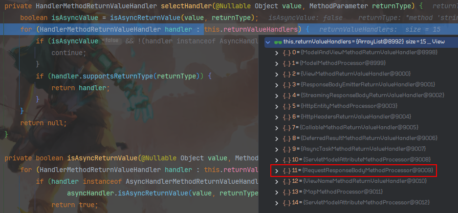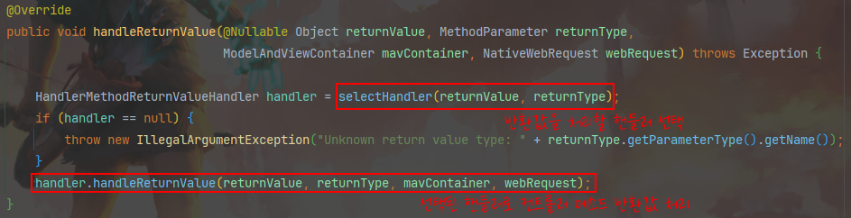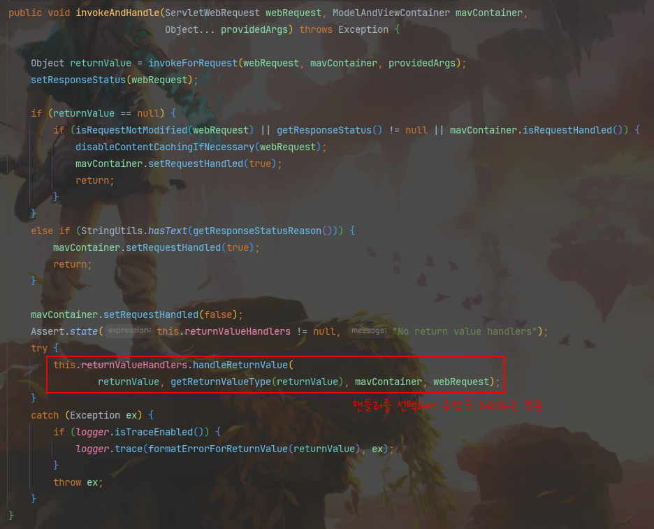 ServletInvocableHandlerMethod는 자신의 returnValueHandlers라는 객체의 handleReturnValue()를 호출합니다. 이 메소드가 실제로 핸들러를 선택해서 컨트롤러 메소드의 반환값을 처리하는 역할이죠.