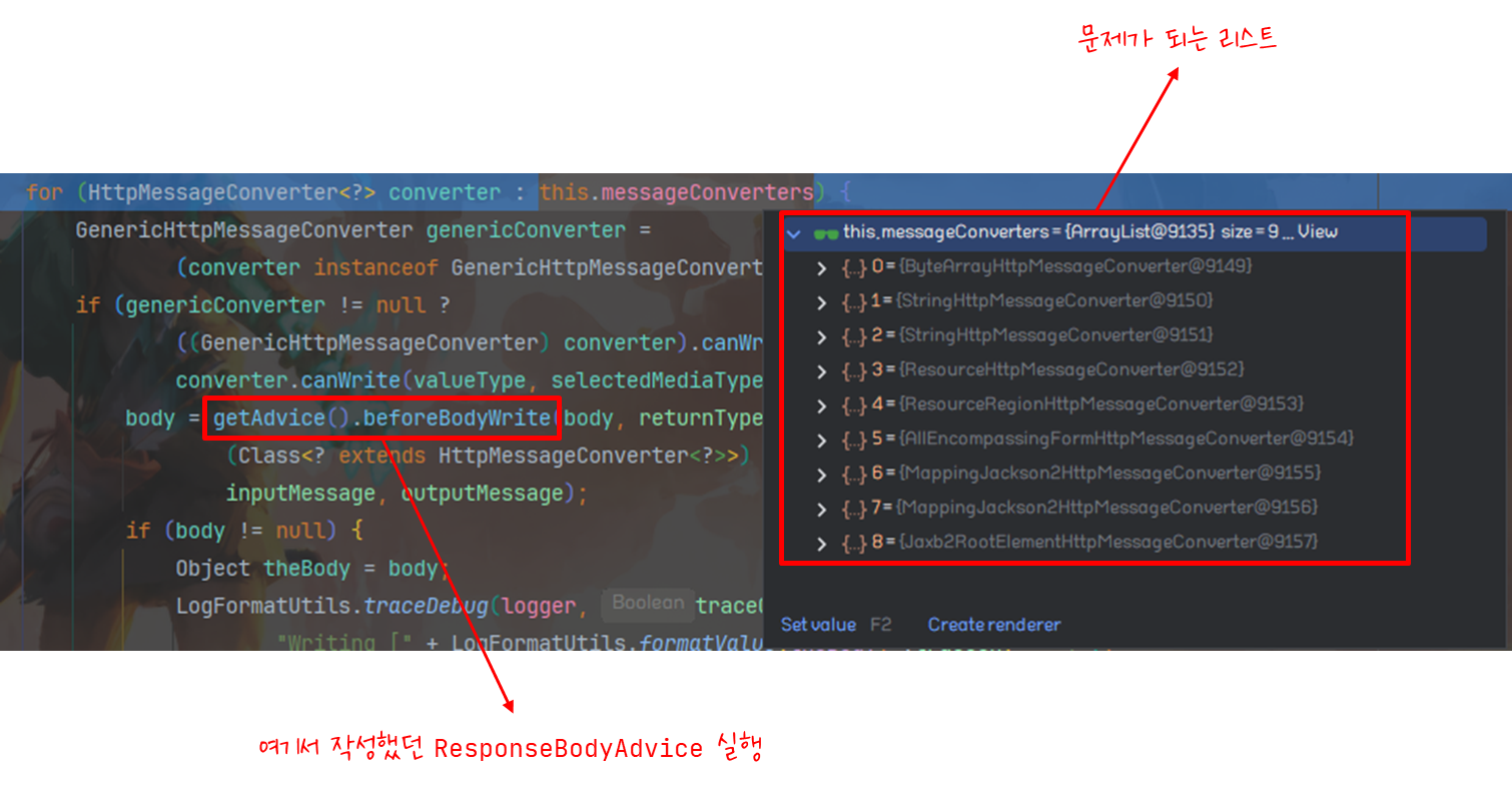 RequestResponseBodyMethodProcessor에서 HttpMessageConverter를 탐색하는 과정을 보면 for문을 사용해서 HttpMessageConverter 리스트를 순차적으로 탐색하고 있습니다. 리스트를 순차적으로 탐색하다가 사용할 수 있는 컨버터를 발견하면 작성해둔 ResponseBodyAdvice를 실행한 후 HTTP 응답 본문을 작성해서 반환하죠.