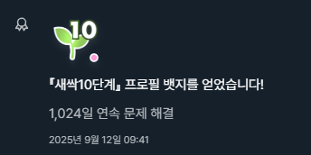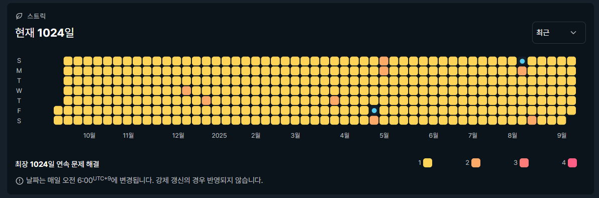별 생각 없이 문제를 풀어오고 있었는데 어느새 1024일 연속으로 스트릭을 달성했더군요.