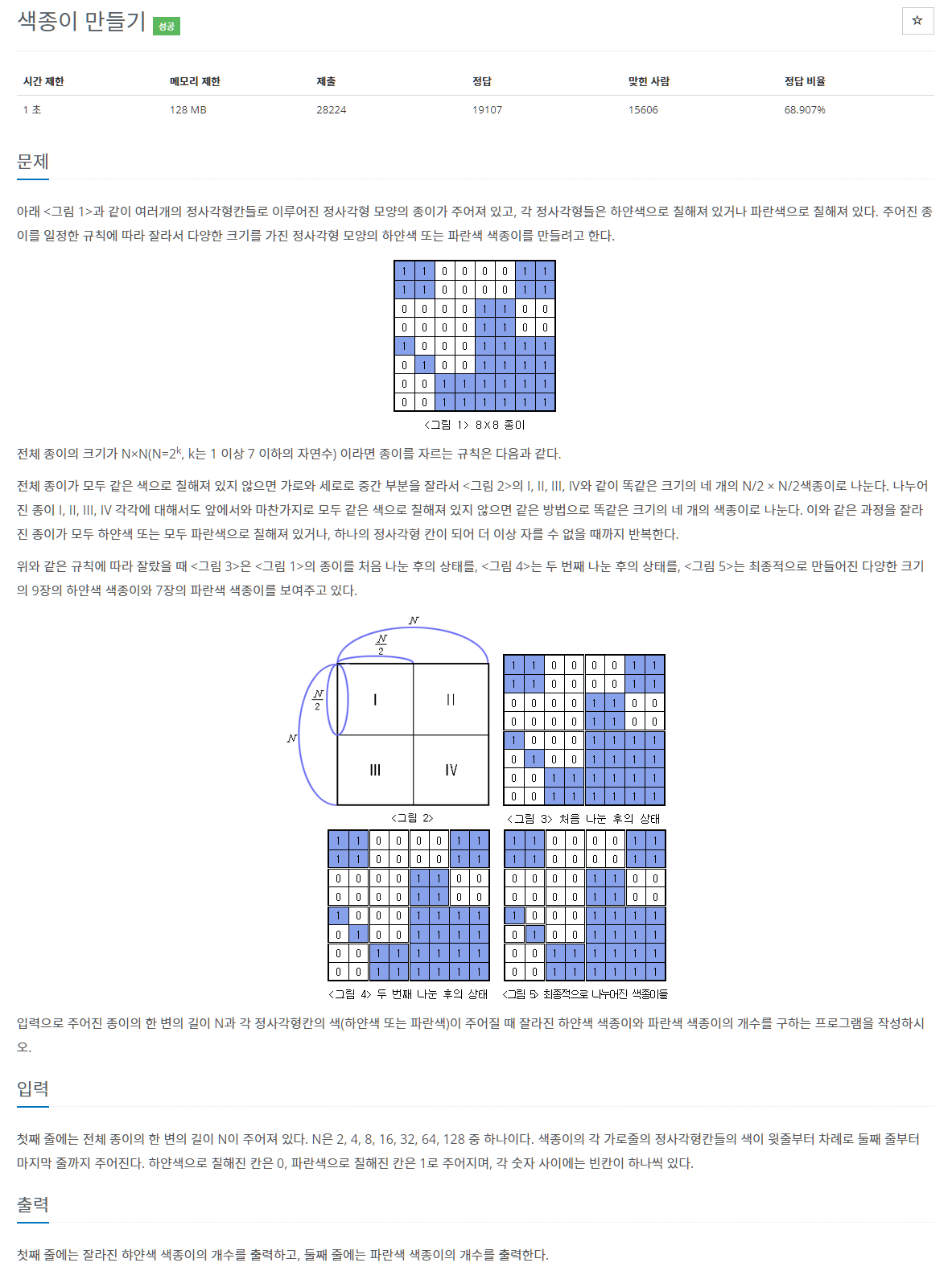 기본적인 분할정복 문제다. 주어진 크기에 맞는 2차원 배열을 만든 후 전체 크기부터 검사를 시작해서 색종이로 사용할 수 없으면 4등분하여 다시 검사를 한다. 검사하는 중에 색종이로 사용할 수 있는 경우(=해당 구간의 모든 요소가 같은 경우)면 해당 색상의 색종이 개수를 1 증가시키고 해당 부분은 검사를 종료한다.