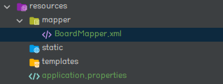 /src/main/resources 폴더 내부에 위에서 mybatis.mapper-locations에 설정한 이름의 폴더를 생성하고 BoardMapper.xml 파일을 생성하고 아래와 같이 작성한다. 이 예제에서는 /src/main/resources/mapper에 해당한다. namespace의 값은 4번 단계에서 생성한 인터페이스 파일의 경로를 입력한다.