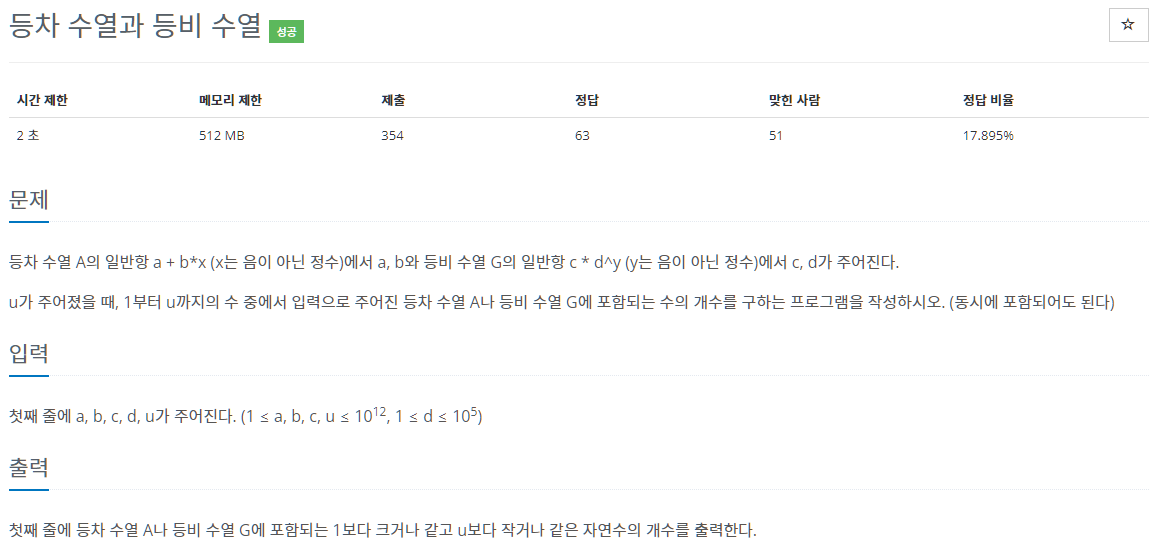 문제만 보면 "그냥 등차 수열과 등비 수열을 set에 저장하고 크기를 출력하면 되는게 아닌가?" 싶지만 입력 범위에 함정이 있다. u의 범위가 \(10^{12}\)까지, 즉 1조라는 큰 숫자이기 때문에 a와 b가 1이고 u가 \(10^{12}\)이라면 등차 수열을 구하는데만 10,000초의 시간이 걸리게 될 뿐만 아니라1 1조개의 Long타입을 set에 저장하게 되므로 7TB가 넘는 엄청난 양의 메모리를 차지하게 된다. 그렇기 때문에 좀 더 수학적인 방법의 접근이 요구된다.