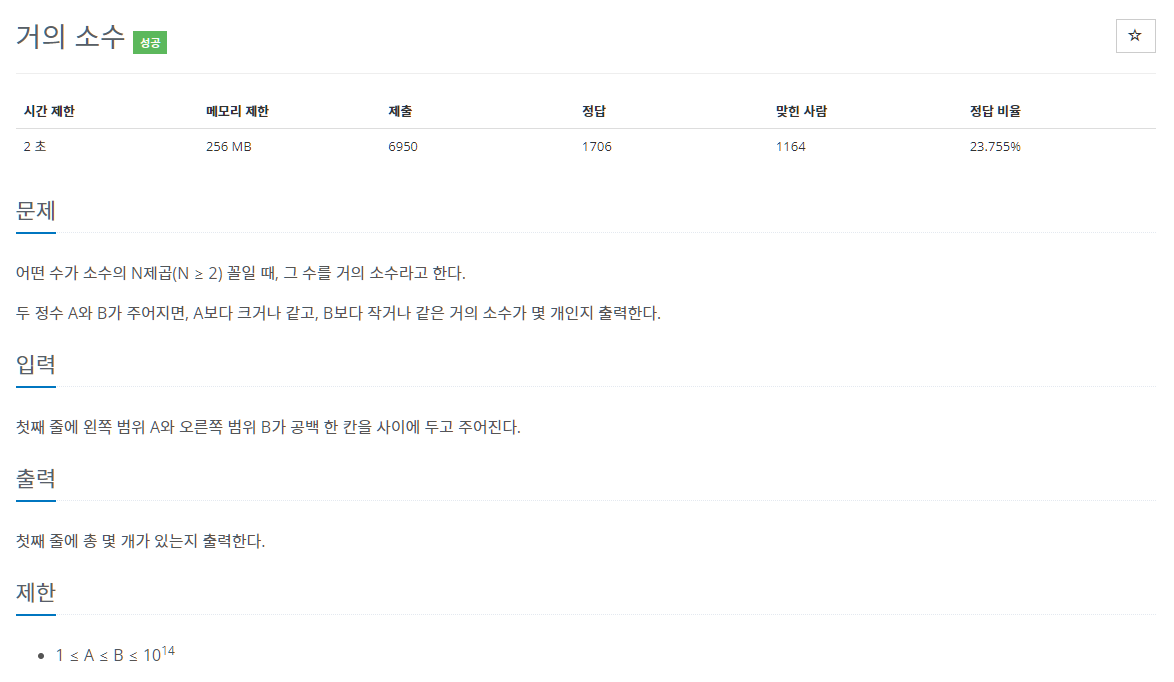 수의 범위가 주어졌을 때 해당 범위 내에서 소수의 거듭제곱이 되는 수의 개수를 찾는 문제다.
